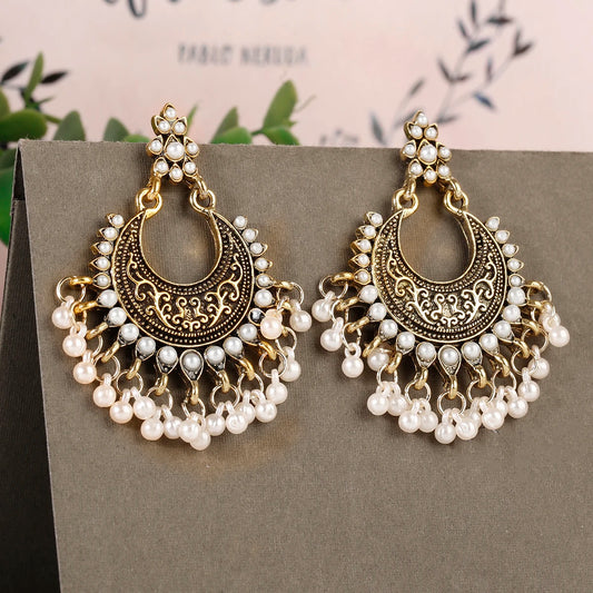 Luxury Retro Big Sector Carved Indian Earrings For Women Piercing Ethnic Bollywood Pearl Tassel Earrings