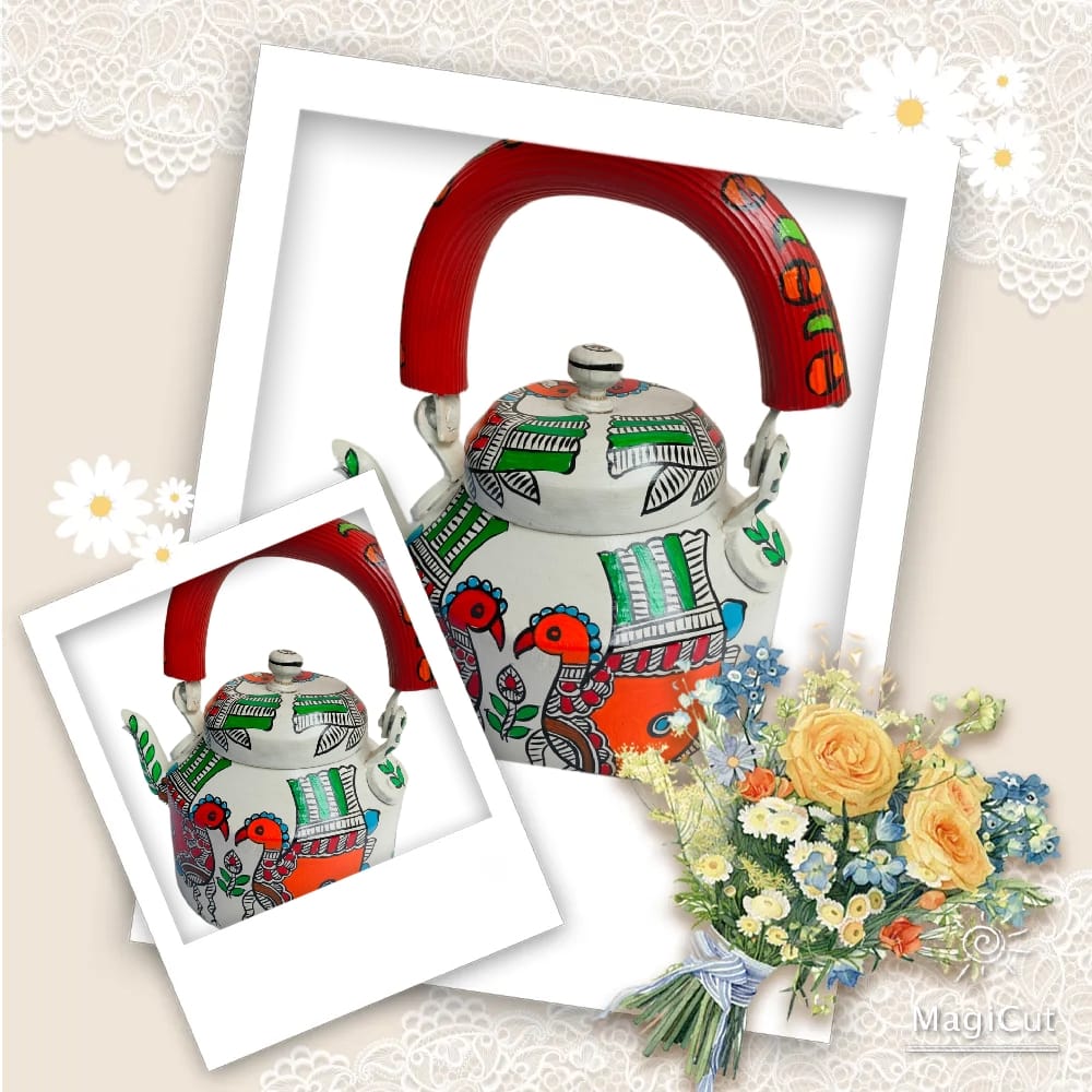 Elevate your tea time experience with a unique touch of Mithila Madhubani art. This beautifully hand-painted metal chai kettle is not only a functional addition to your kitchen but also a stunning work of art. Experience the beauty and tradition of Indian techniques with every pour.