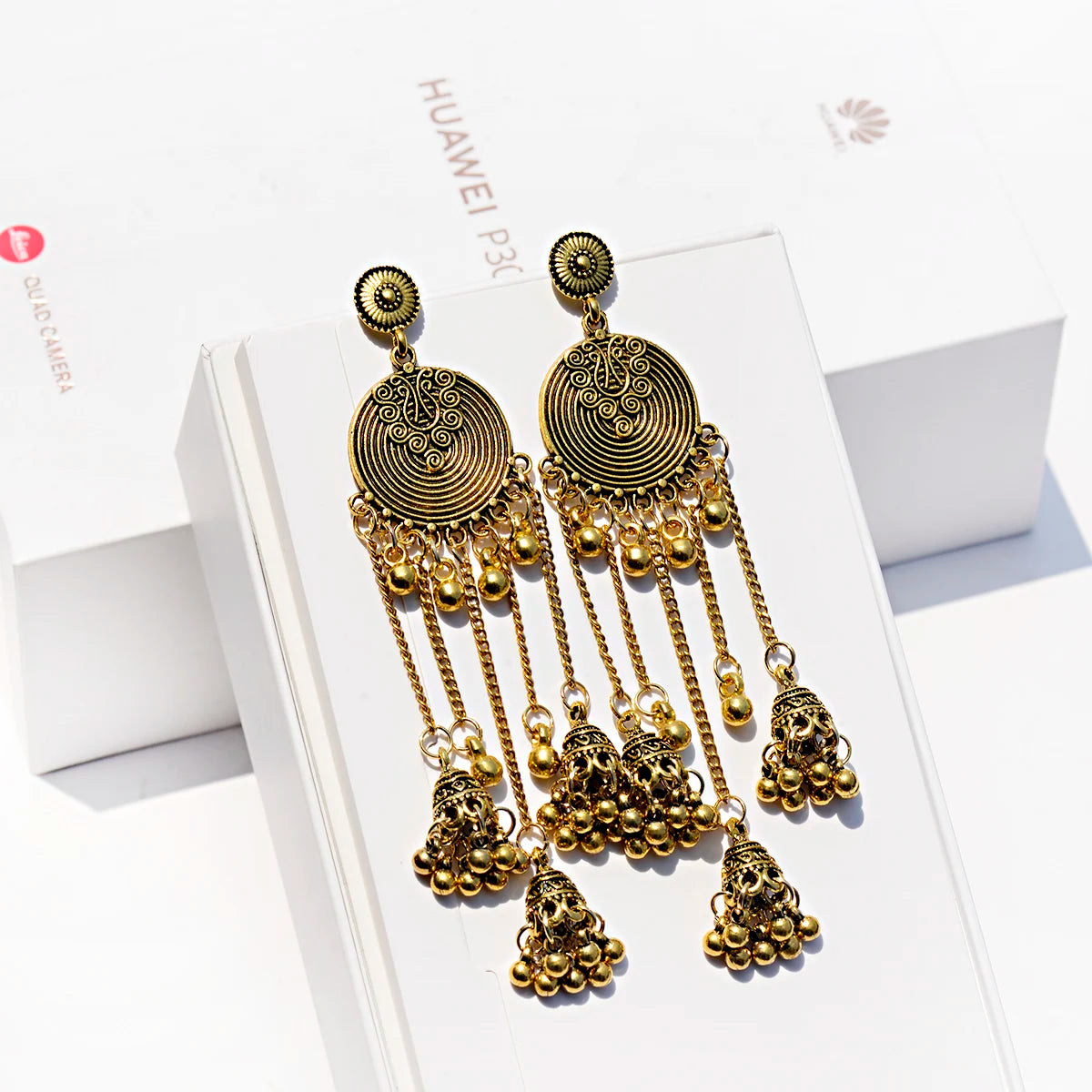 New Indian Jhumka Earrings Retro Jewelry For Women Boho Ethnic Vintage Golden Long Tassel Drop Round Beaded Ear rings Jewelry